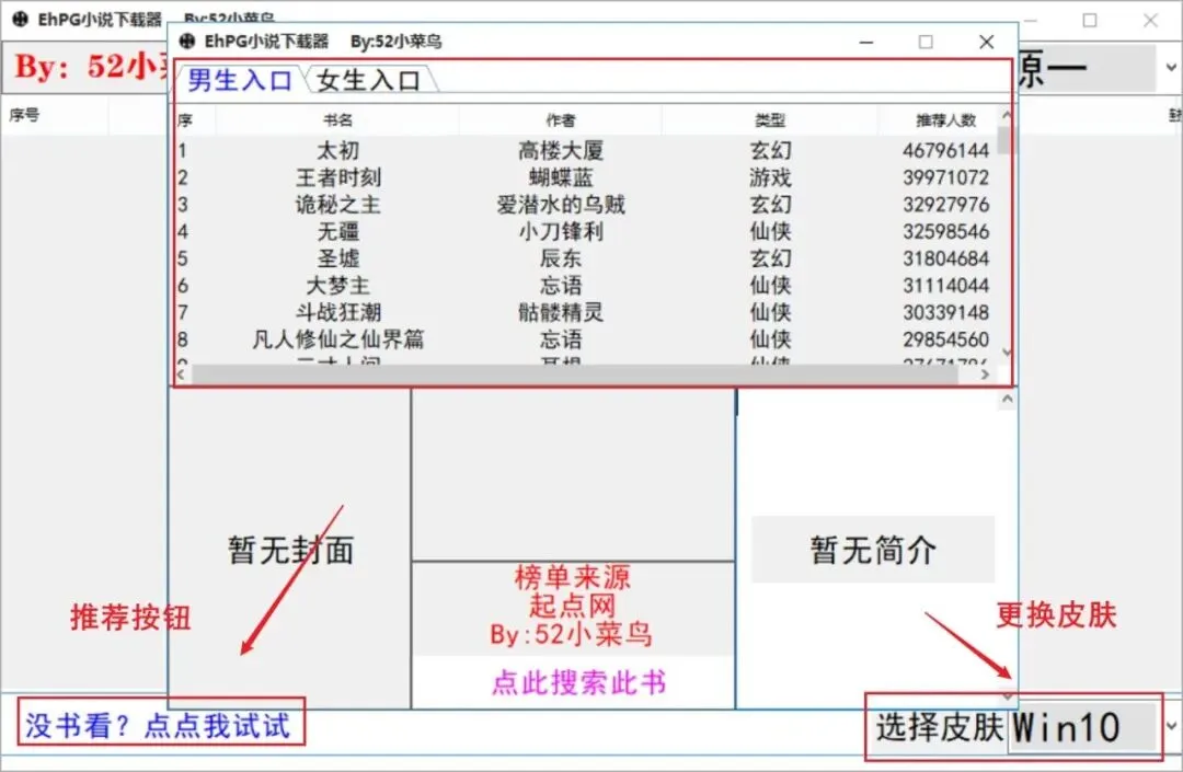 软件左下角是小说推荐按钮,书荒的朋友可以试试,不过想必大家都是带着目的来的,这个功能也就无足轻重了。右下角皮肤更换按钮可以更换软件的界面皮肤。