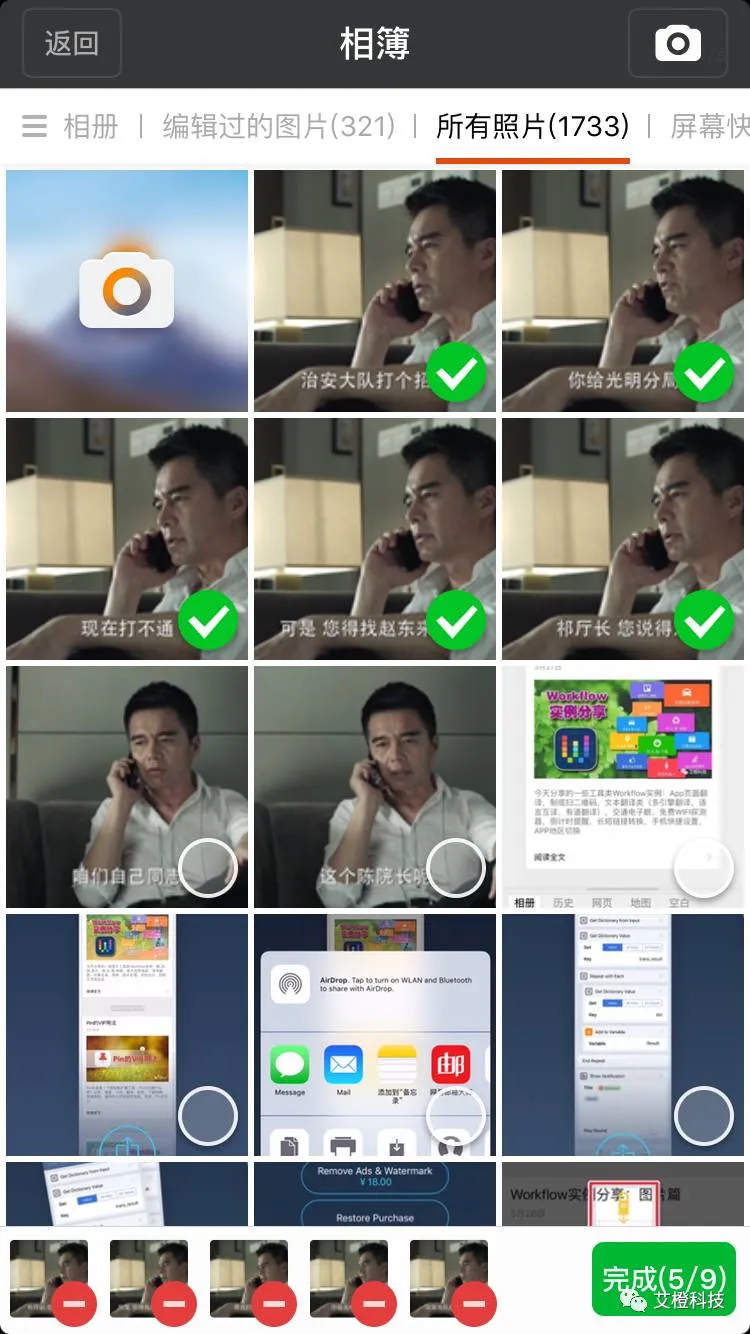 选图界面,一次只能选择9张图片。而九宫格拼接则需选择够9张图才会显示按钮。