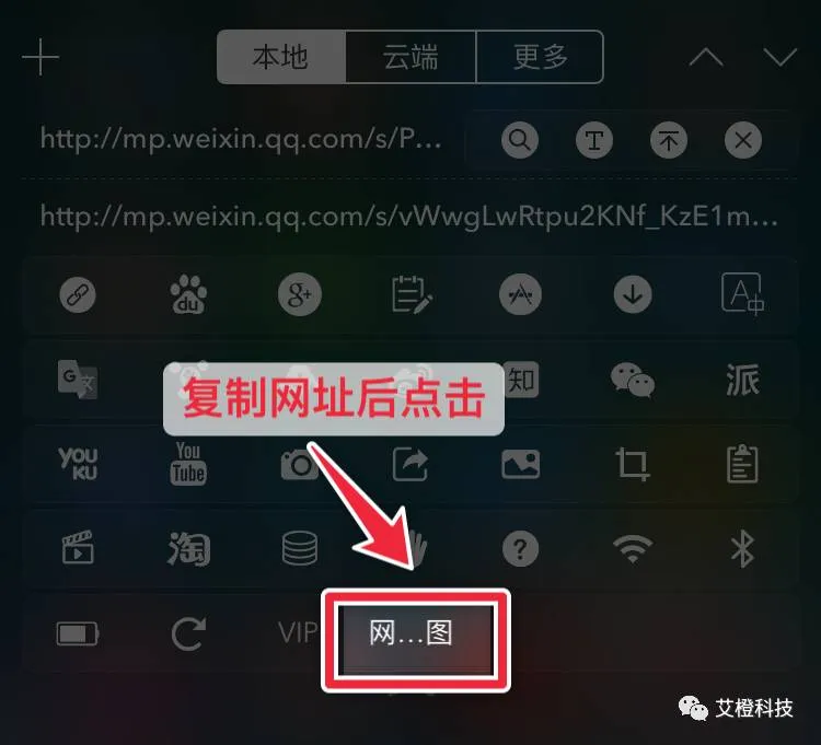 复制想要截图的网址,通知中心点击刚才添加的网页截图按钮: