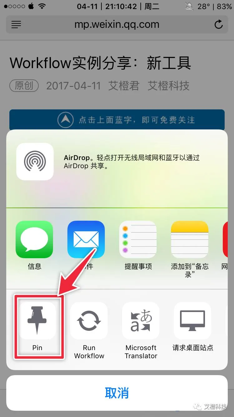 (2),在Safari打开你想要截图的网页,点击分享按钮,弹出菜单,选择Pin: