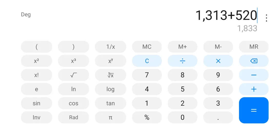 君君一开始是这样觉得的,但直到君君把手机横屏后,居然发现了新大陆:计算器秒变成科学计算器了,原先比较简单的纯加减乘除计算一下子变成了包含各类复杂运算符号的计算器界面。