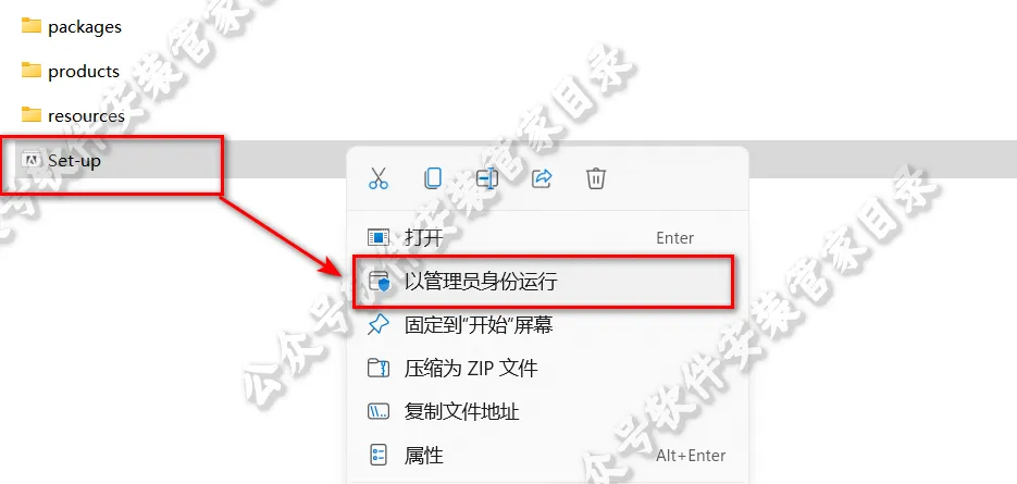 2.打开解压后的文件夹,找到并选中Set-up,鼠标右键点击“以管理员身份运行”