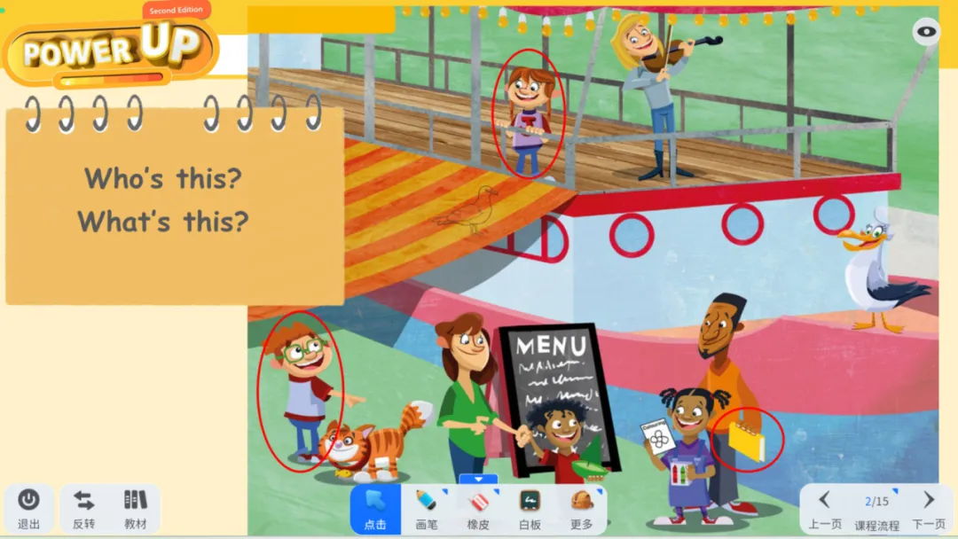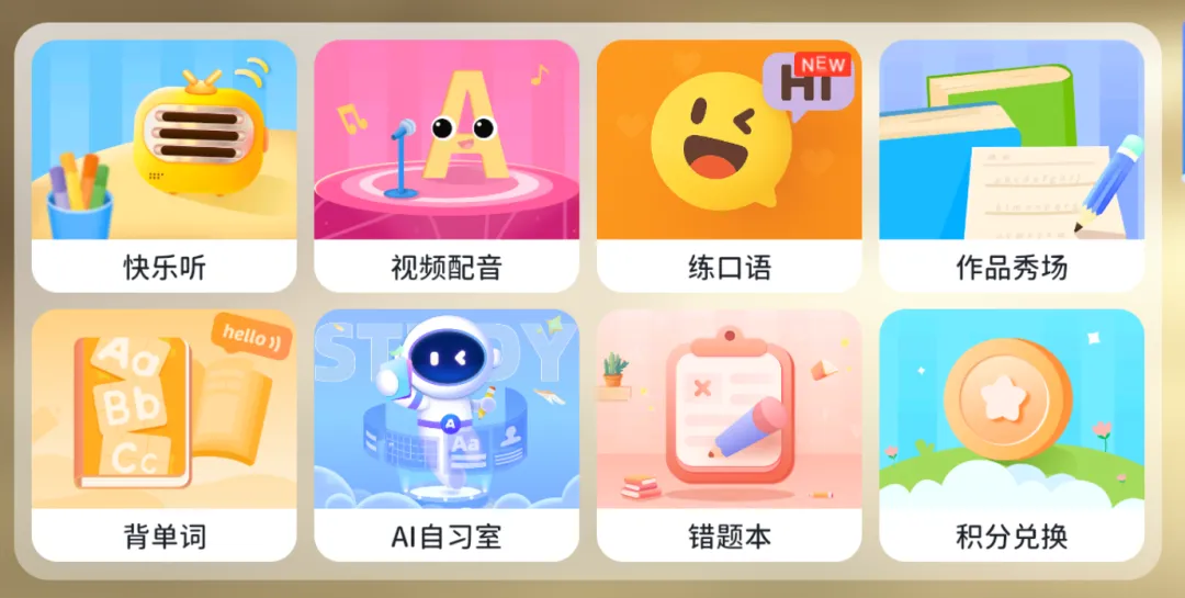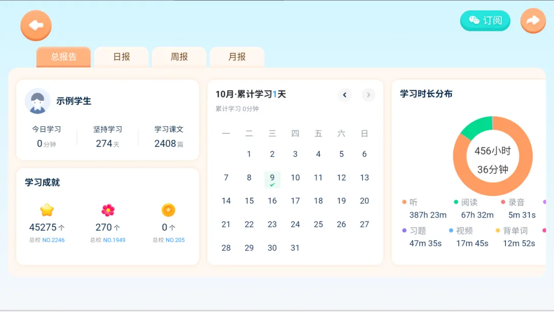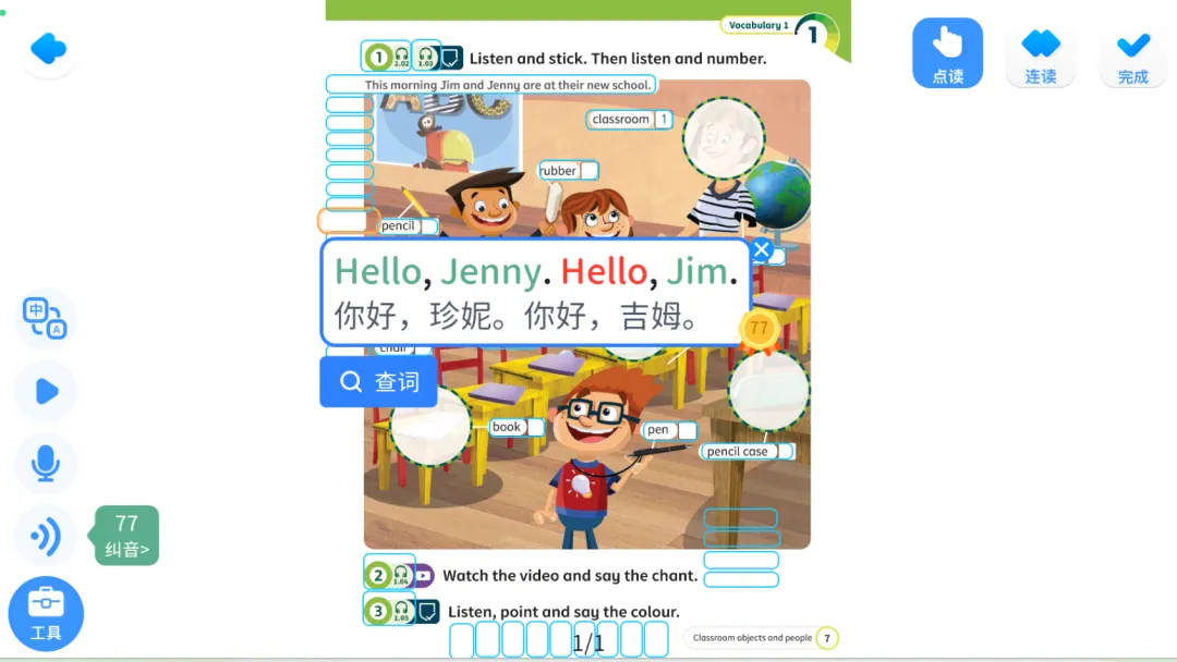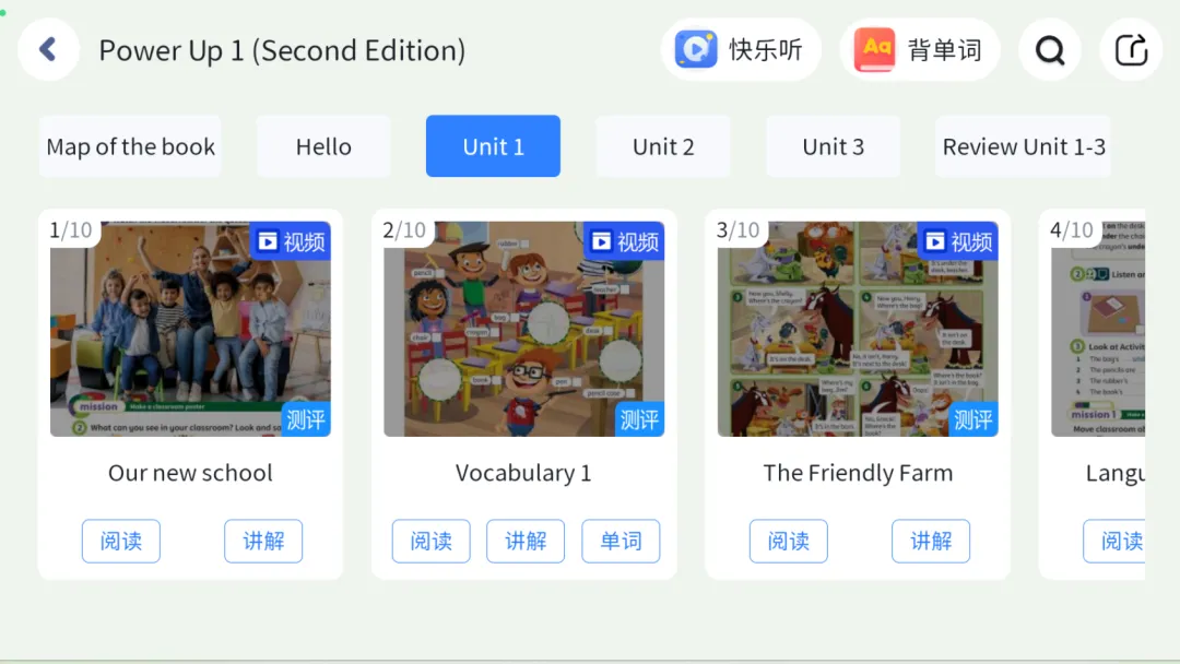 原版教材:点读,跟读,测评,单词习题,配套的视频,讲解功能老师还可以给教材做讲解,课后布置讲解内容给学生复习。配套来的课外阅读丰富学生积累。
