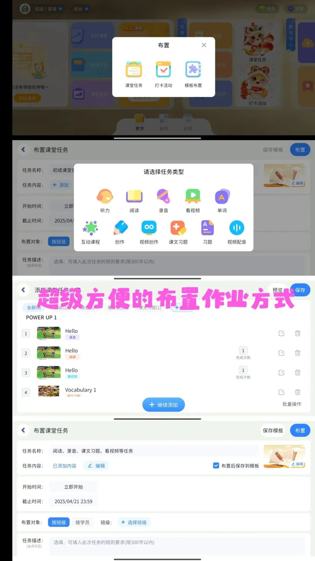 4、课前备课,课后十一种布置作业的方式随意搭配,布置的作业还可以保存模版,重复使用