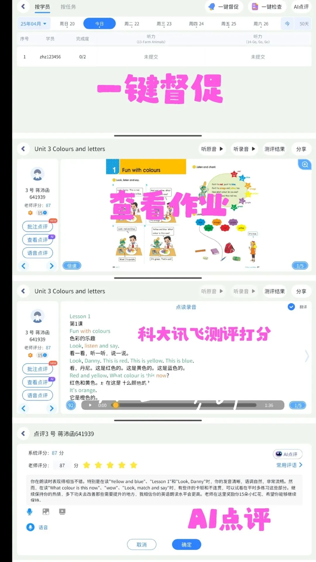 强大的课后作业系统,十一种作业类型搭配布置,可布置单次的课堂作业,也可以搭配多天的打卡作业。学生提交的作业一键检查,AI批改(利用腾讯元宝和DeepSeek的底层架构,根据科大讯飞测评结果和学生语境语调综合评价),还可以老师自己精细化的批注语音点评。