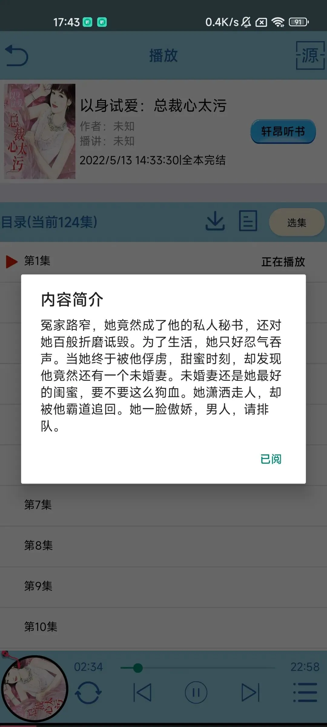 在小说播放的界面还可以查看小说简介、更新章节,小说最近的更新时间也能够看到。