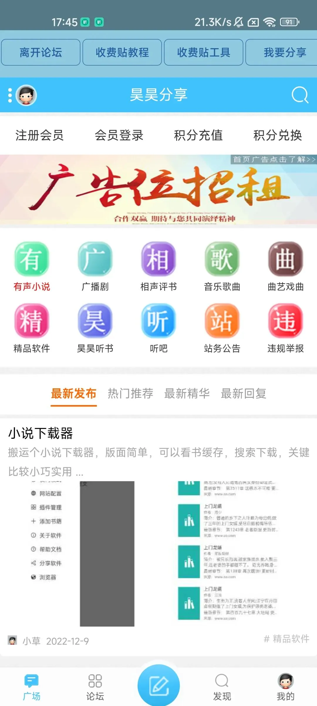 论坛功能让啊明比较意外,网友们不定期分享各种小说资源、下载器等等。