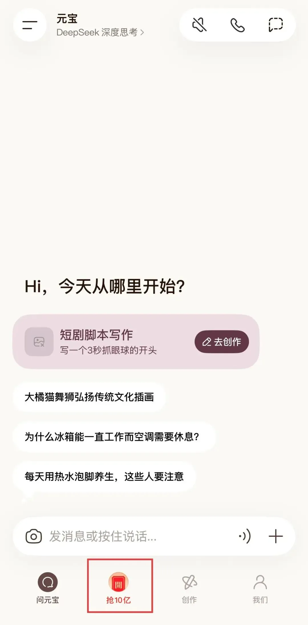 1. 麻溜的:去把“腾讯元宝”App更新到最高版,首页下面那个“抢10亿”点进去。