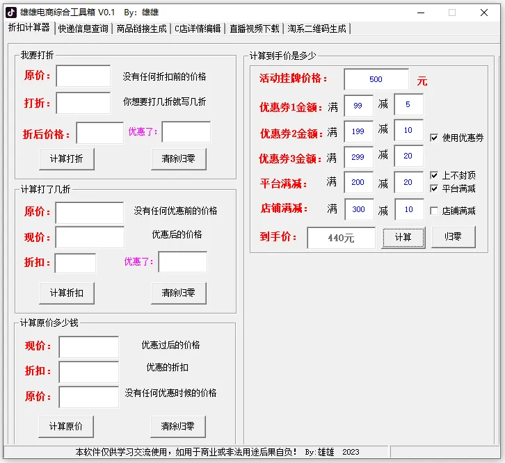 ,有折扣计算器、快递信息查询、商品链接生成、直播视频下载、淘系二维码生成等功能。软件绿色免安装只有一个exe文件,对于喜欢购物或者搞电商的摸友,这个工具不能错过。
