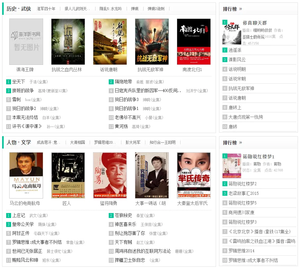 电台、相声、评书、戏曲、有声小说等。目前除了网页端外(网页端仅以电台内容为主),还适配了Android、iOS、车机等。