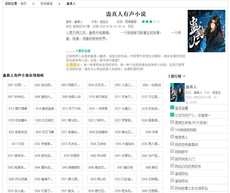 章节都很直观,包含了每个章节的标题,支持自动播放下一集。如果你喜欢听书,又不想忍受那些需要开通会员才能解锁以及不想忍受广的打扰,那么这个网站绝对可以满足你的需求。