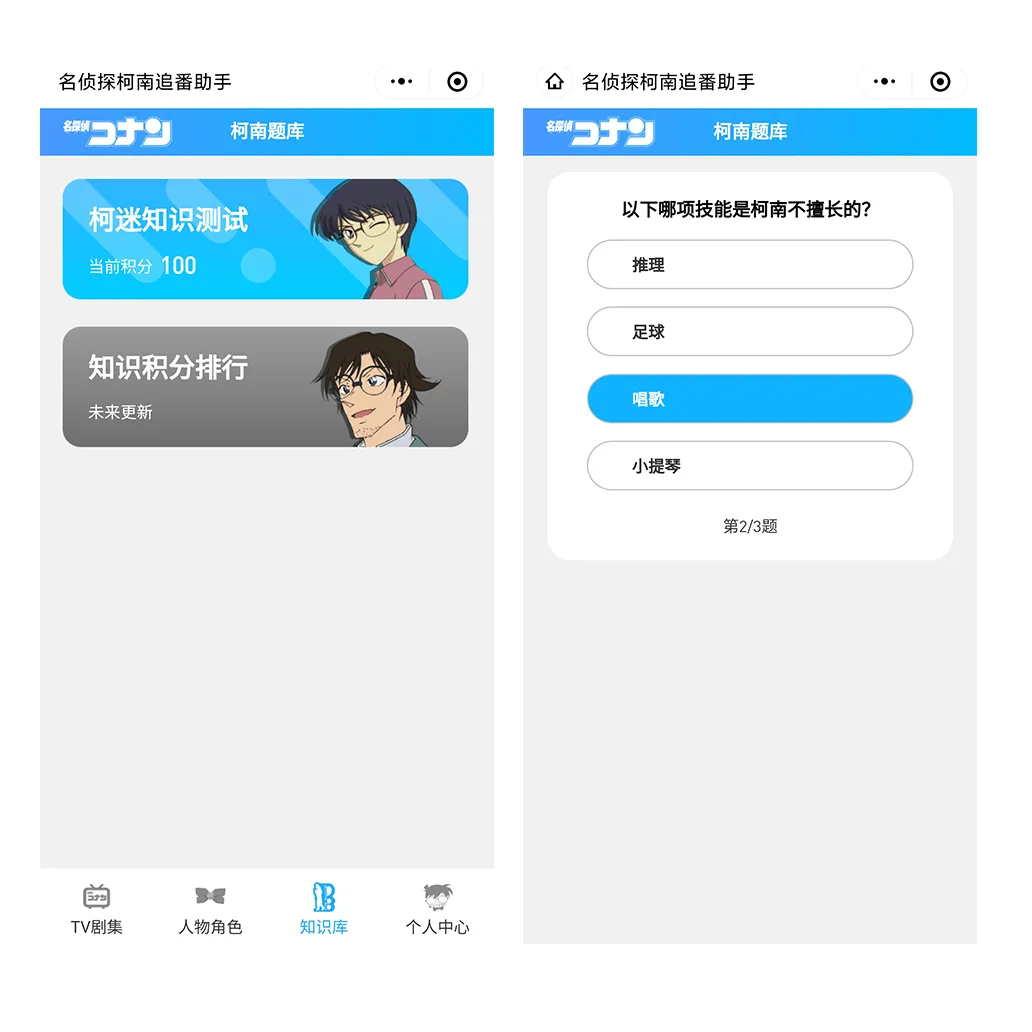 每天可进行柯南知识问答,测试你对柯南的了解程度;