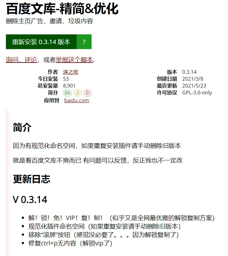 萝卜哥前段时间分享过一款由萝卜哥好友制作的油猴脚本,支持去除百度文库广告以及免费全屏预览等几个会员权限,目前新版本也已经发布,新增了免vip复制文字的功能,欢迎下载体验!