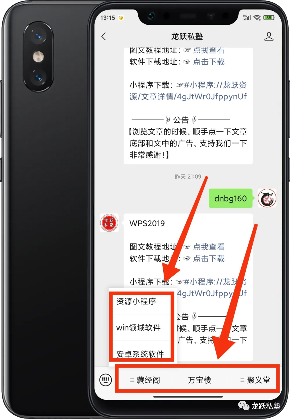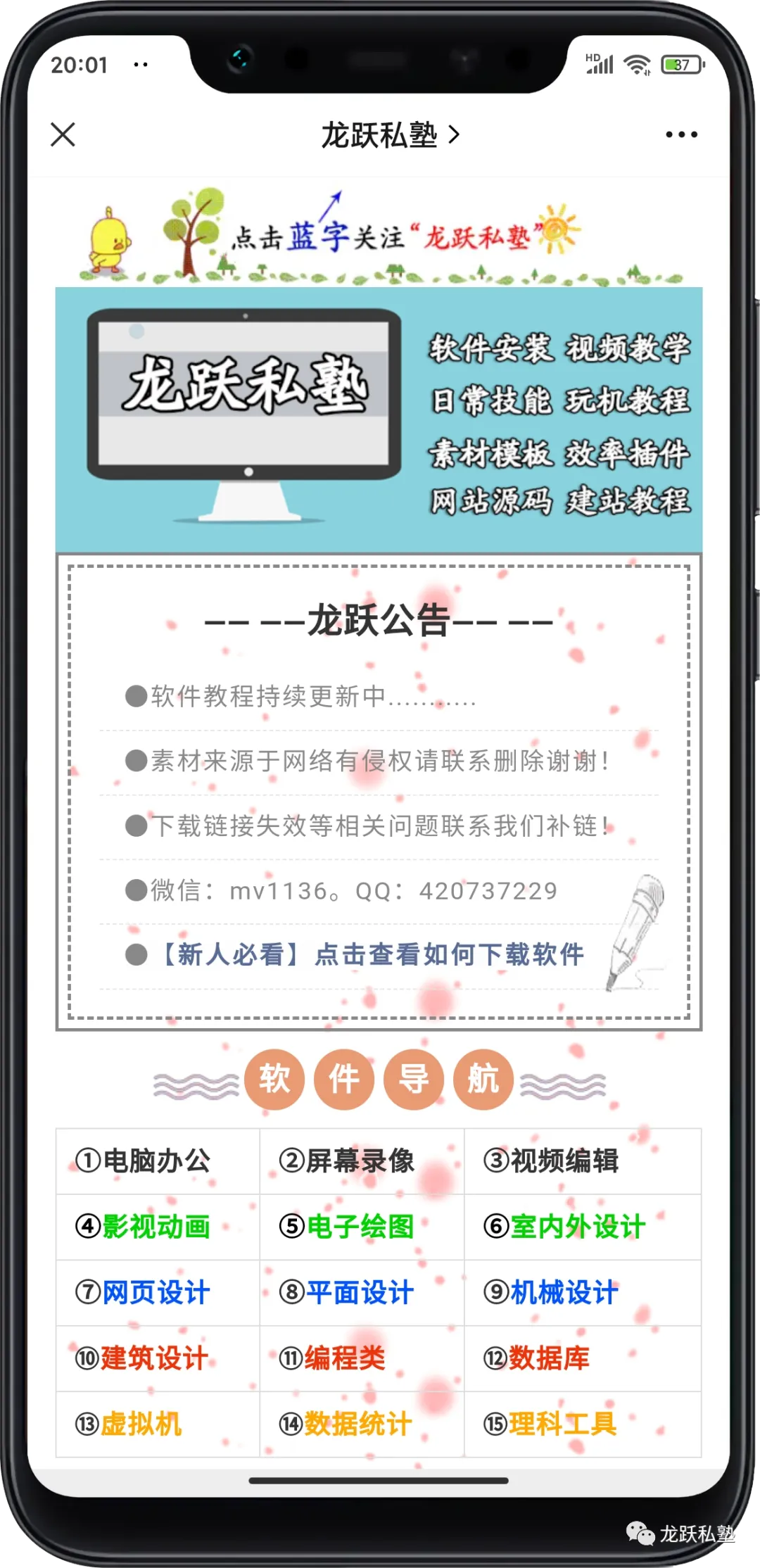 在公众号的对话框底部菜单栏有不同的软件目录入口、选择自己需要的目录打开查找需要的软件。