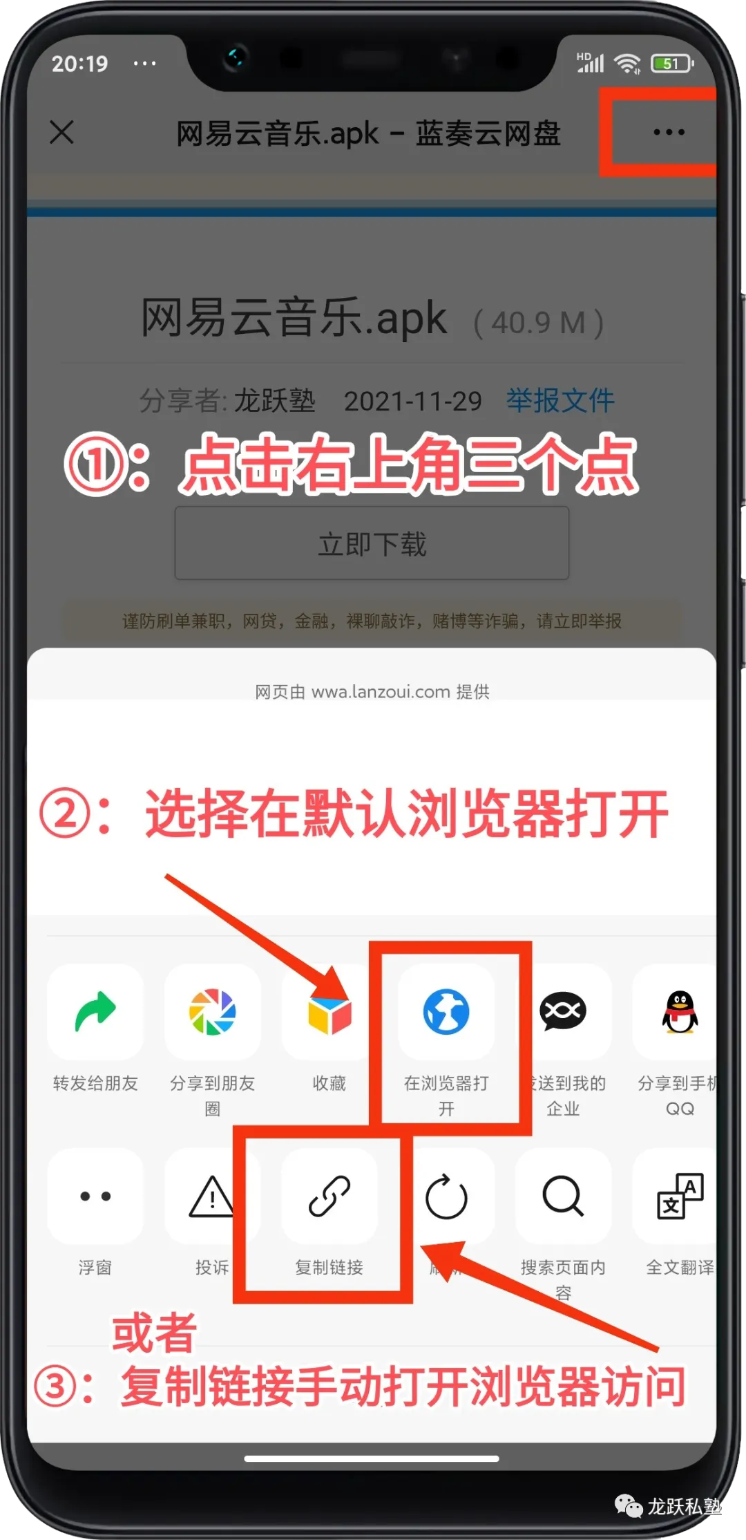 四、 软件下载、在公众号对话框回复关键词、自动获取下载地址、点击蓝色字体“点击下载”即可跳转至下载页面、在下载页面点击右上角【…】选择【默认浏览器】打开。打开后输入提取码点击【立即下载】