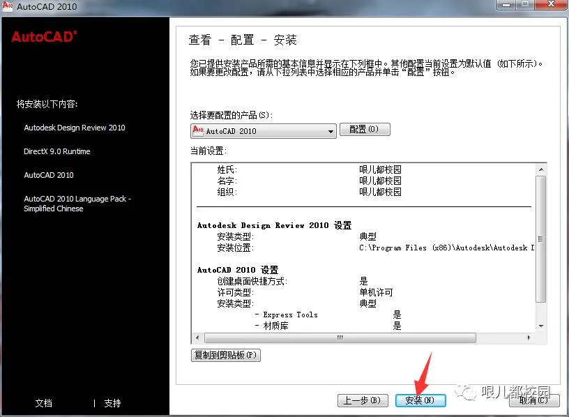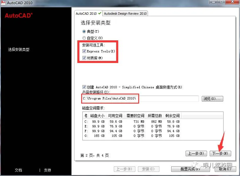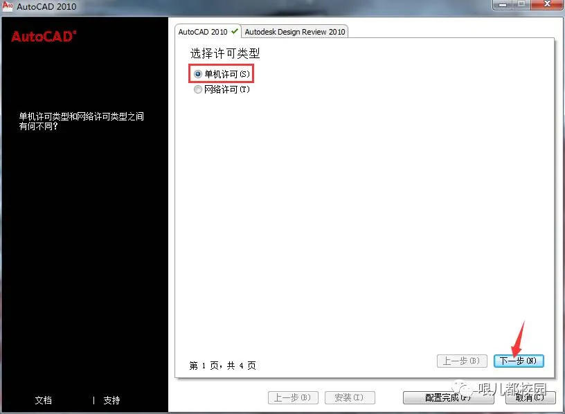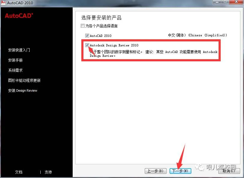 4.根据个人需求决定是否勾选Autodesk Design Revie 2010(一般不选这个),然后点击“下一步”