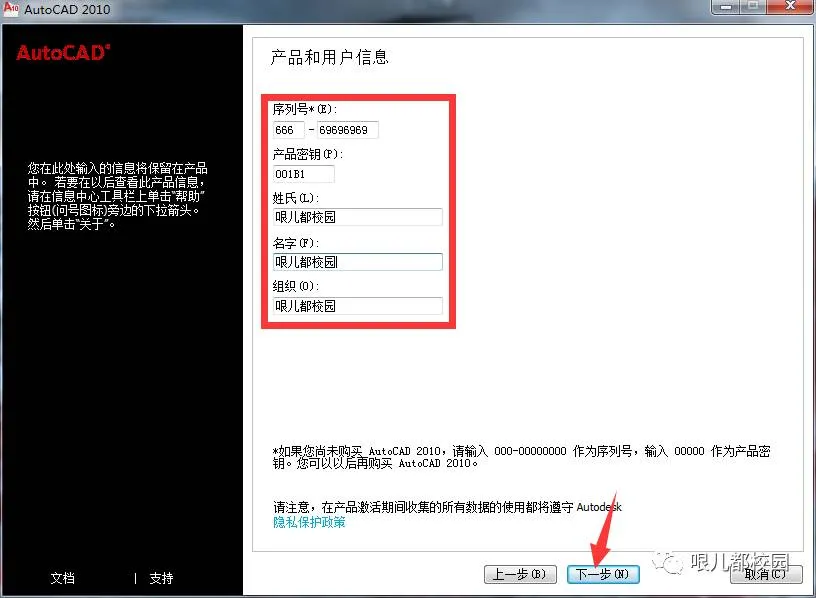 6.输入序列号:666-69696969,产品密钥:001B1,姓氏、名字、组织等随便输入,然后点击“下一步”