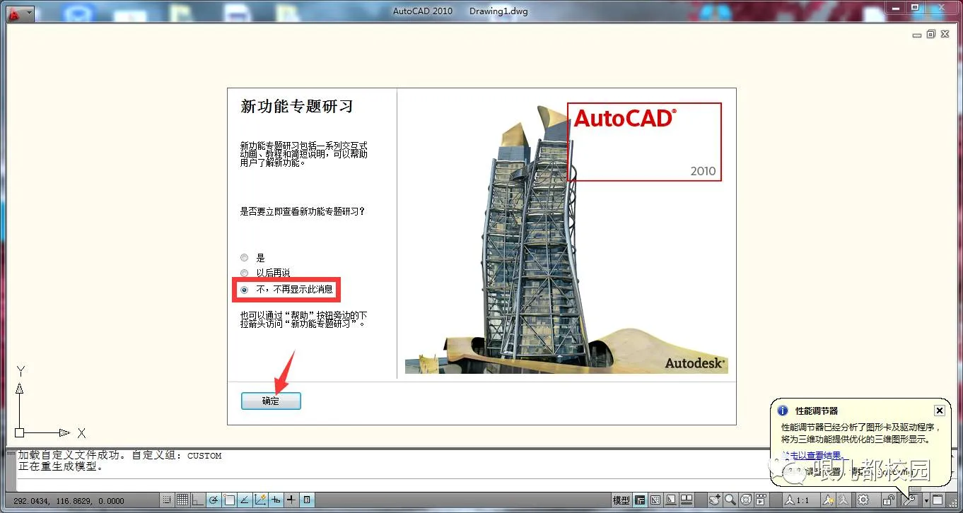 17.把“AutoCAD 2010 下次启动时提醒我”前面的勾去掉,然后点击“启动 AutoCAD 2010″