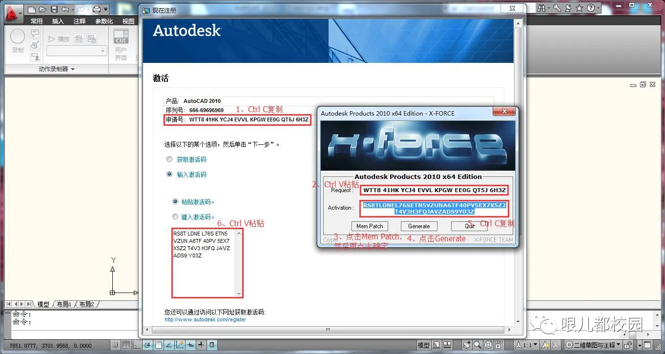 23.把申请号“Ctrl C”复制,“Ctrl V”粘贴到注册机里面的Request,先点击“Mem Patch”,再点击“Generate”,然后“Ctrl C”复制激活码,然后再“Ctrl V”粘贴激活码。