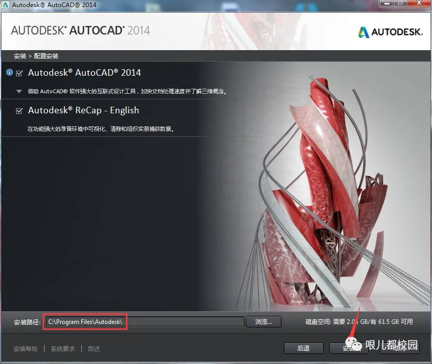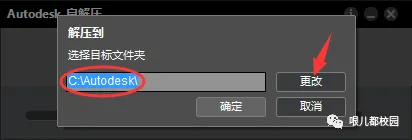 6.接下来选择安装路径。可以使用默认路径,也可以自行更改(路径中不要有中文即可)。然后点击“安装”。如下图默认路径为:C:\Program Files\Autodesk\ 可以直接将C改为D