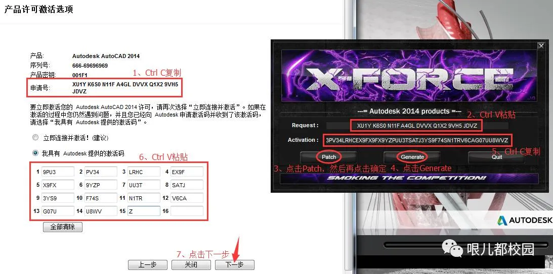 15.把申请号“Ctrl C”复制,“Ctrl V”粘贴到注册机里面的Request,先点击“Patch”,再点击“Generate”,然后“Ctrl C”复制激活码,然后再“Ctrl V”粘贴激活码,最后点击“下一步”即可。