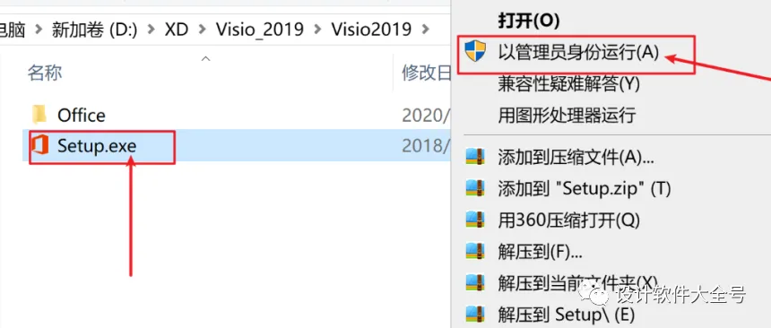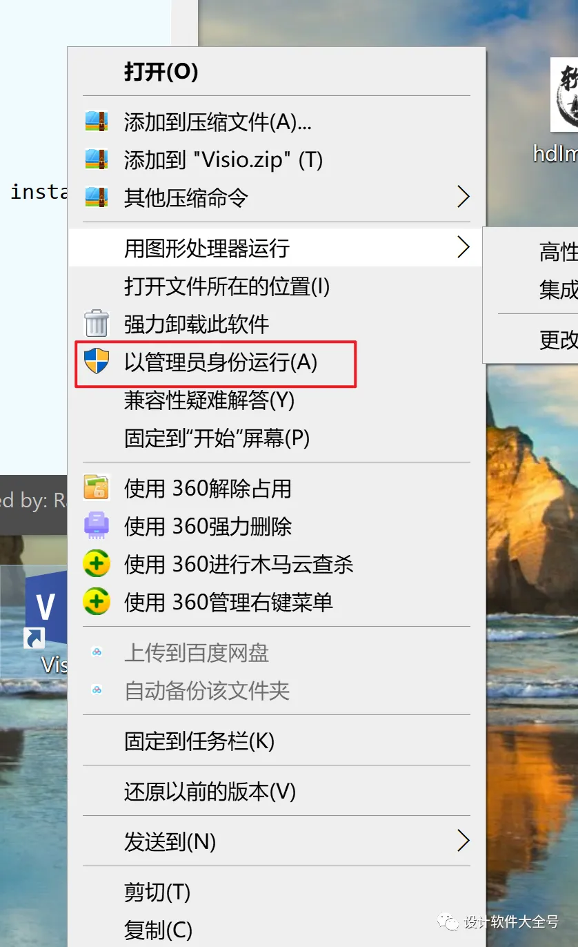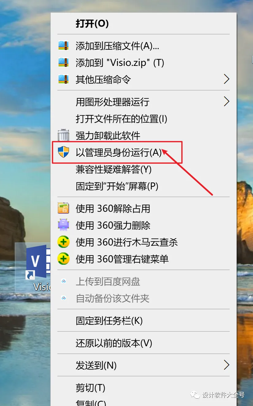 5.回到桌面找到刚刚拖到桌面的Visio2019的图标右键以管理员身份运行,具体操作如下图所示: