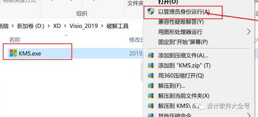 11.返回之前的安装文件,找到破解文件里面的kms文件(右键以管理员身份运行)。具体操作如下图所示: