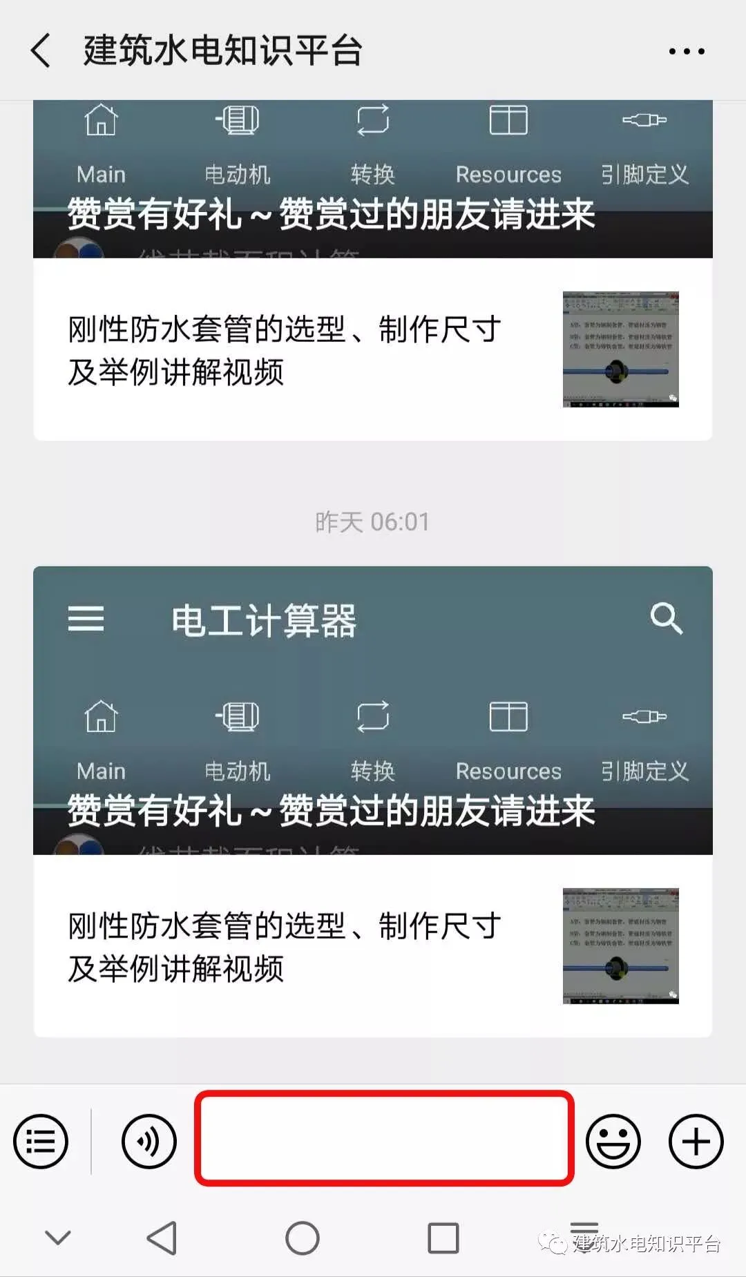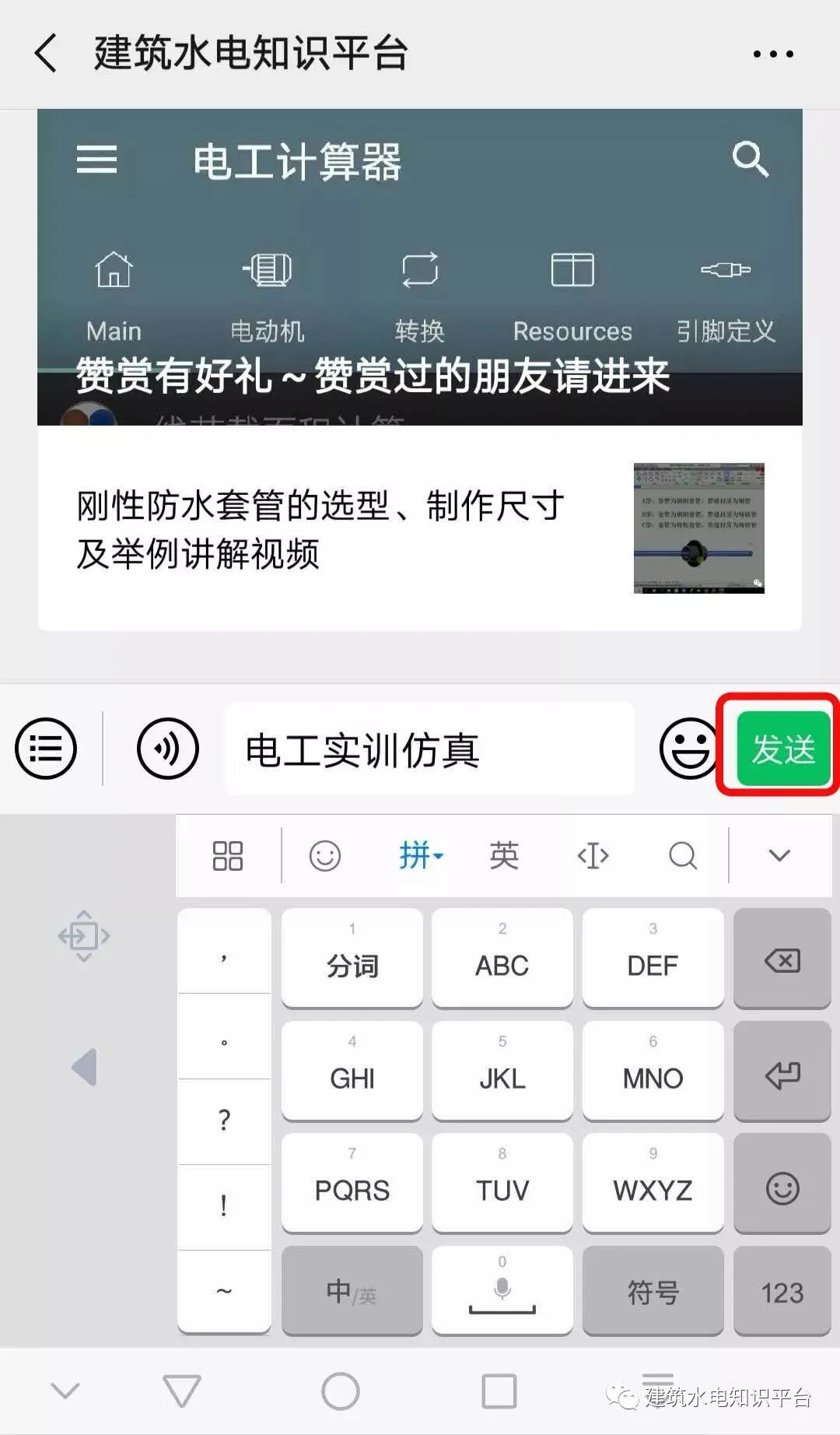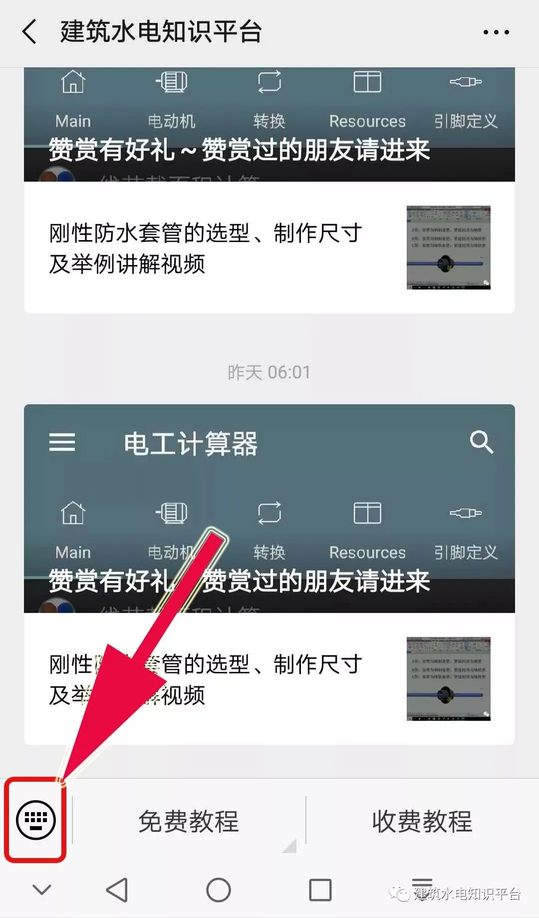 第一步:打开微信公众号:建筑水电知识平台,点击下图红色箭头指向的红色方框