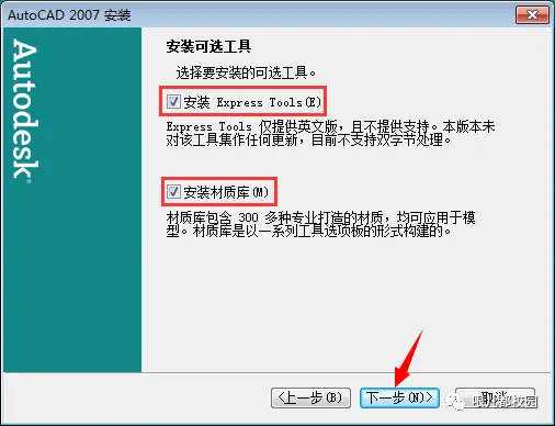 11.选择安装 Express Tools和安装材质库,点击下一步