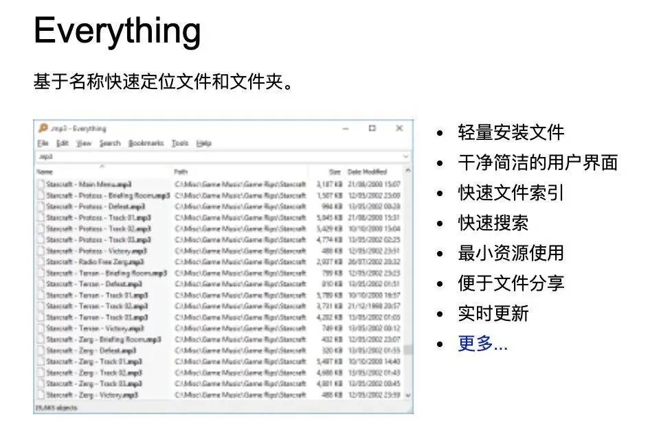 Everything 是 voidtools 开发的一款文件搜索工具。它体积小巧,程序文件只有 0.99M。界面简洁易用,可以帮助我们快速搜索电脑上的文件,而且基本上不会有遗漏。