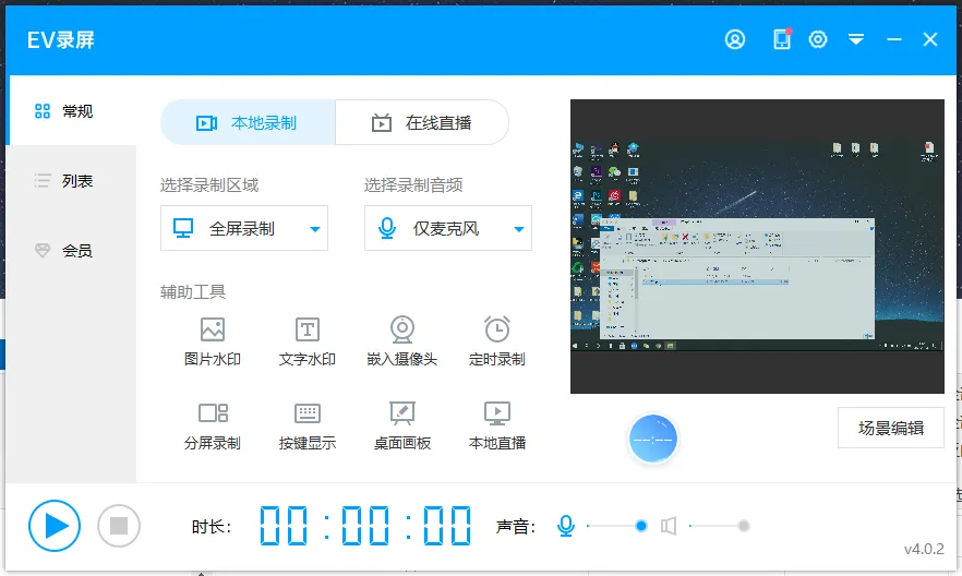 功能介绍:EV 录屏(EVCapture)是一款国产免费的视频录制工具+直播推流软件。操作界面非常简单清晰,可选本地视频或者在线直播,然后设置录制区域,全屏局部都可以。音频,可以录制系统声音、麦克风声音,或者不录制声音,我们选仅麦克风也可以!