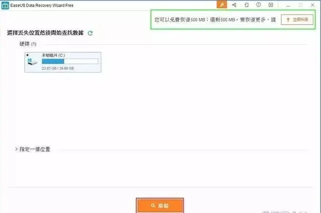 别担心,EaseUS Data Recovery 帮您恢复。它是免费版本,当然有一些限制,下图绿色框中可以看到只有恢复 500MB 的数据。