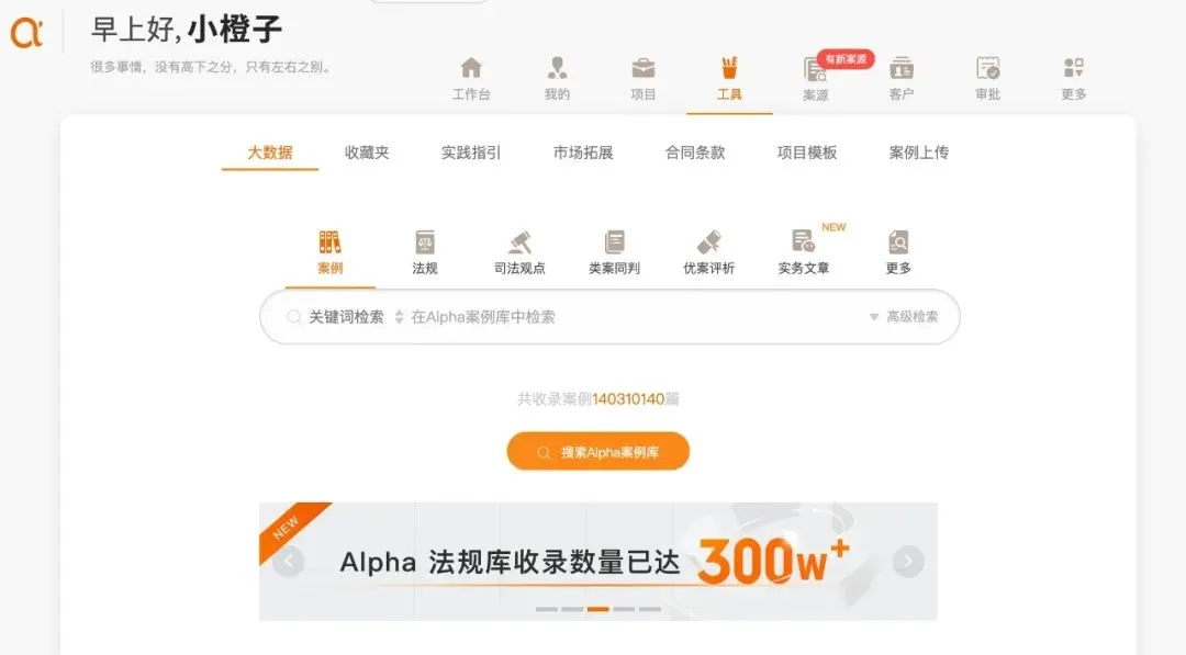 最后,还有大家最熟悉的 Alpha。不仅是律师管理系统,更是律师团队效率提升专家!All in one!是集法律数据库、案件管理、专业服务和律所管理为一体的法律智能操作系统。并能够提供专业的裁判文书、法律法规和行政处罚检索等服务。