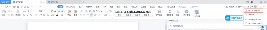 5)打开WPS任意组件(如Wps文字),点击右上角的【设置】→【输入序列号】