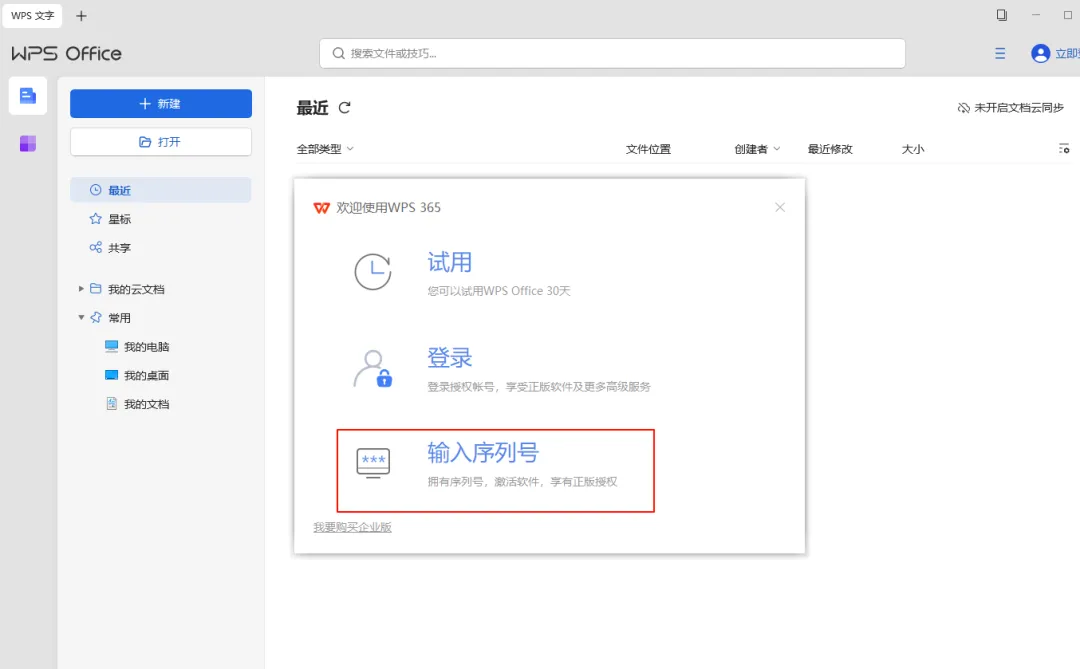 5)打开WPS任意组件(比如WPS文字),弹出对话框,输入序列号。