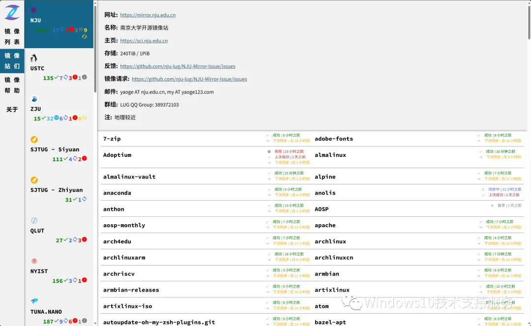 除此之外,在“镜像站们”页面,可以看到南京大学、清华大学等等高校镜像站。