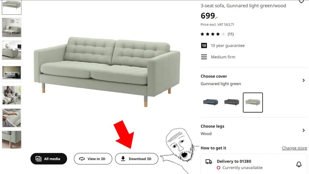 宜家官网虽支持多款产品的 3D 视图查看,但这一功能往往无法让你直观预判家具摆进家中的实际效果。有开发者制作了一款免费的开源浏览器插件,能下载宜家的产品 3D 模型,让你可以将模型导入专业的 3D 建模软件中使用。