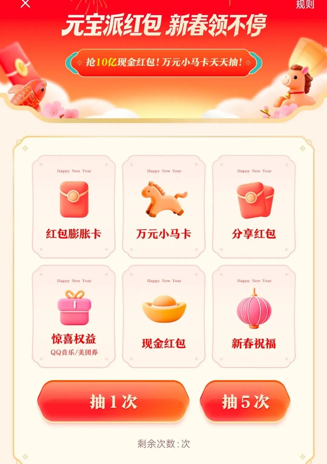 今年突然杀出来的腾讯元宝,在春节的营销上也投入了很多。分十亿的标识一直挂在软件的图标上,推出100张价值1万元的小马卡。通过抽奖的方式拿到奖品,并借助分享的途径传播到更多的用户。除了抽奖外,还有祝福语红包,限时红包雨等活动。