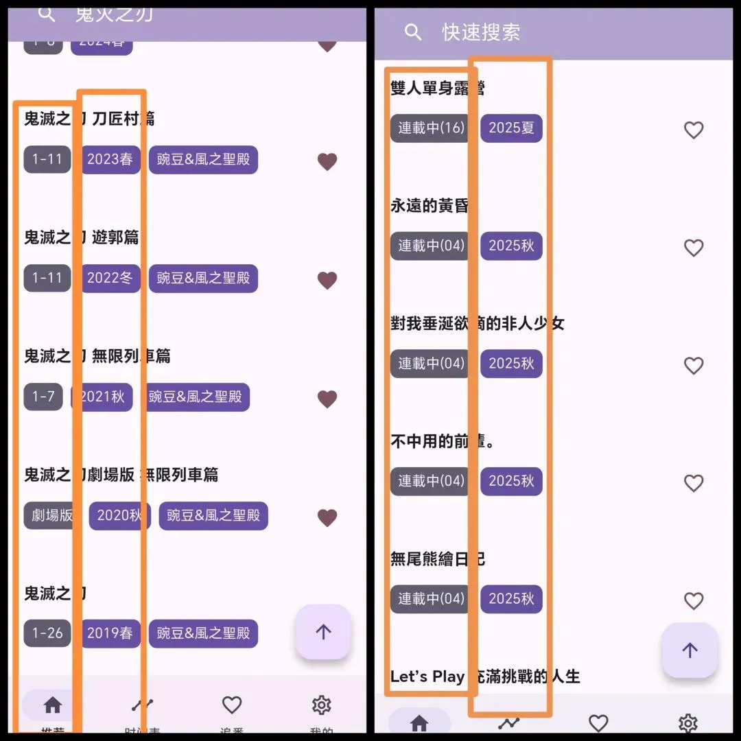 软件全是日番,推荐按出品日期排序并且标注了此番剧的当前状态: 完结,连载中。让每一位追番迷对钟爱的番剧一目了然。