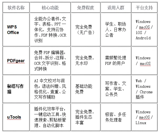 ��推荐理由:WPS是国产办公的绝对王者,PDFgear替代Adobe Acrobat,秘塔写作猫是中文写作的“AI外挂”,uTools则是效率工具的“瑞士军刀”。