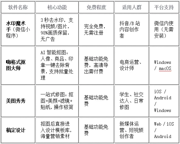 ��推荐理由:水印魔术手是“去水印天花板”,无需下载;嗨格式抠图大师适合专业级批量处理;美图秀秀是小白首选;稿定设计打通“抠图→设计”全流程。