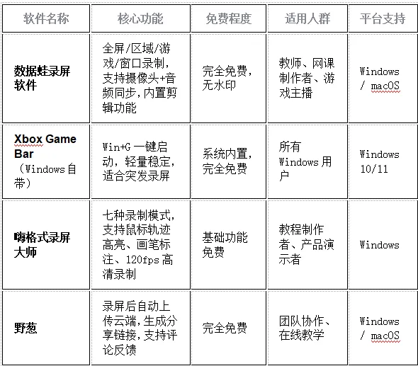 ��推荐理由:数据蛙是功能最全的国产录屏神器,Xbox Game Bar是“应急神器”,嗨格式适合教学场景,野葱专为“分享反馈”优化。