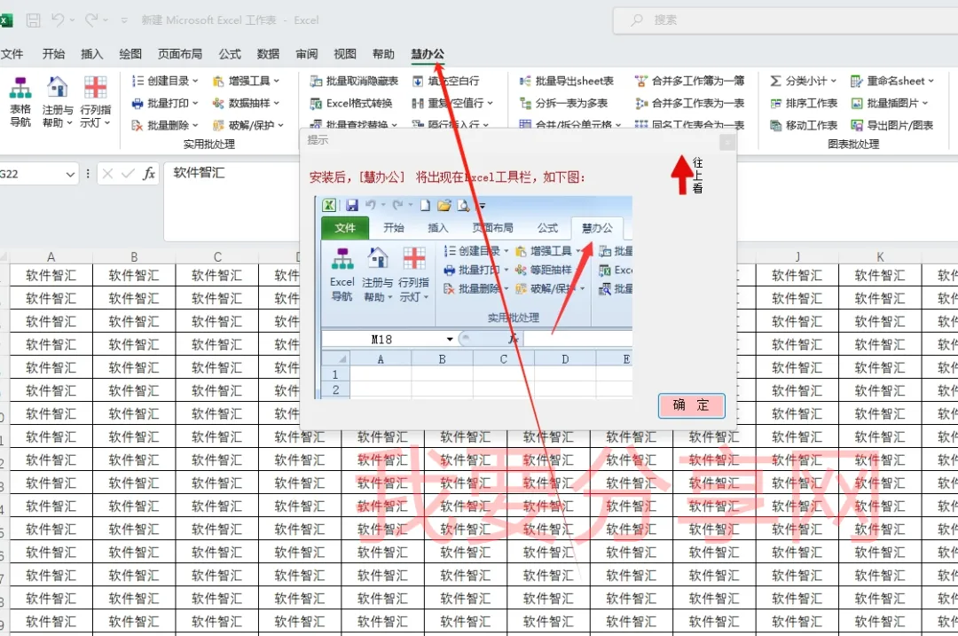 7.打开一个Excel表格,慧办公插件会自动显示在上面,如果有提示确定一下即可。慧办公里面很多快捷功能,好好研究一下,就可以早点下班的
