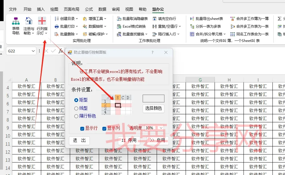 Excel慧办公插件中的聚光灯功能_可使得行列高亮显示,防止看错行/列(并且不会影响excel格式、撤销等功能)。