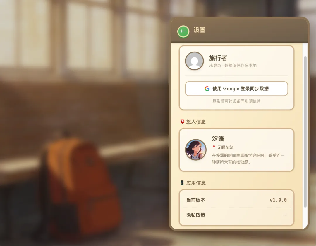 这两天让 opus 实现了一个之前想到的点子,就是表面上这是一款壁纸产品,但是可以让它变得更有趣,具体就是:创造一个虚拟旅人,TA 在一个虚拟的世界中旅行,每天会给你寄一封信,里面有 TA 看到的风景,这个风景会自动更换成你的壁纸,你也可以回信,第二天 TA 会结合你们的互动生成新的内容。