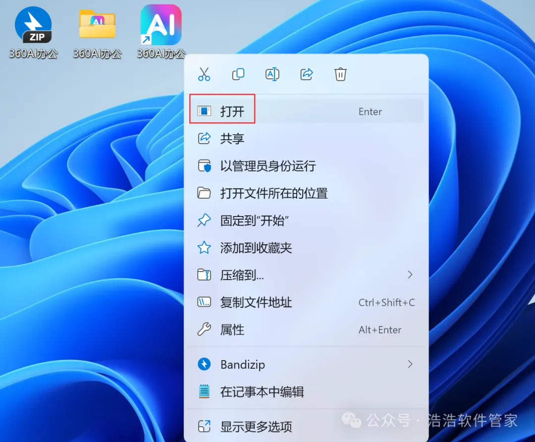 6、回到桌面,右键桌面上的【360AI办公软件图标】,点击【打开】