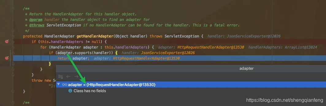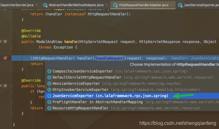 这里handler最终找到的是RequestMappingHandlerAdapter。但同样如果是jsonrpc的标准调用,这里就又不一样了。由于JsonServiceExporter实现了HttpRequestHandler接口,所以这里支持的适配器就是HttpRequestHandlerAdapter。