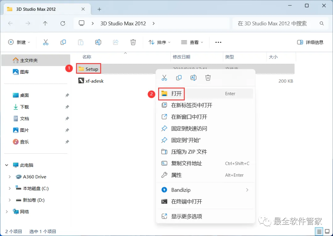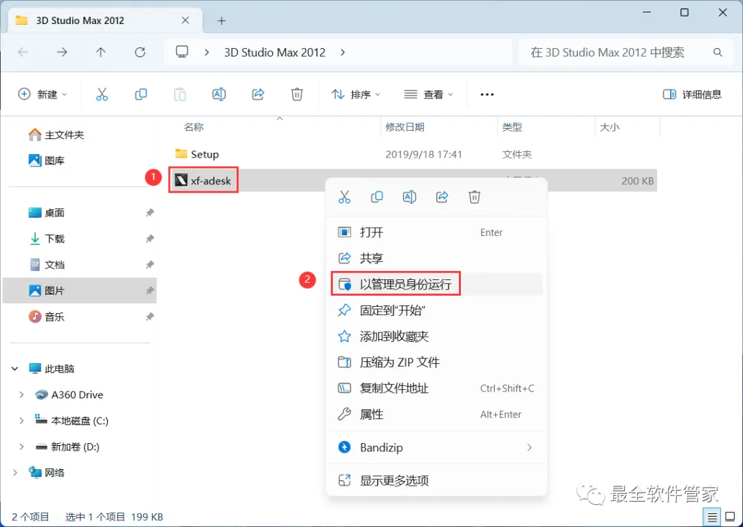 19、回到3D Studio Max 2012文件夹,找到【xf-adesk】程序,再右键选择【以管理员身份运行】它