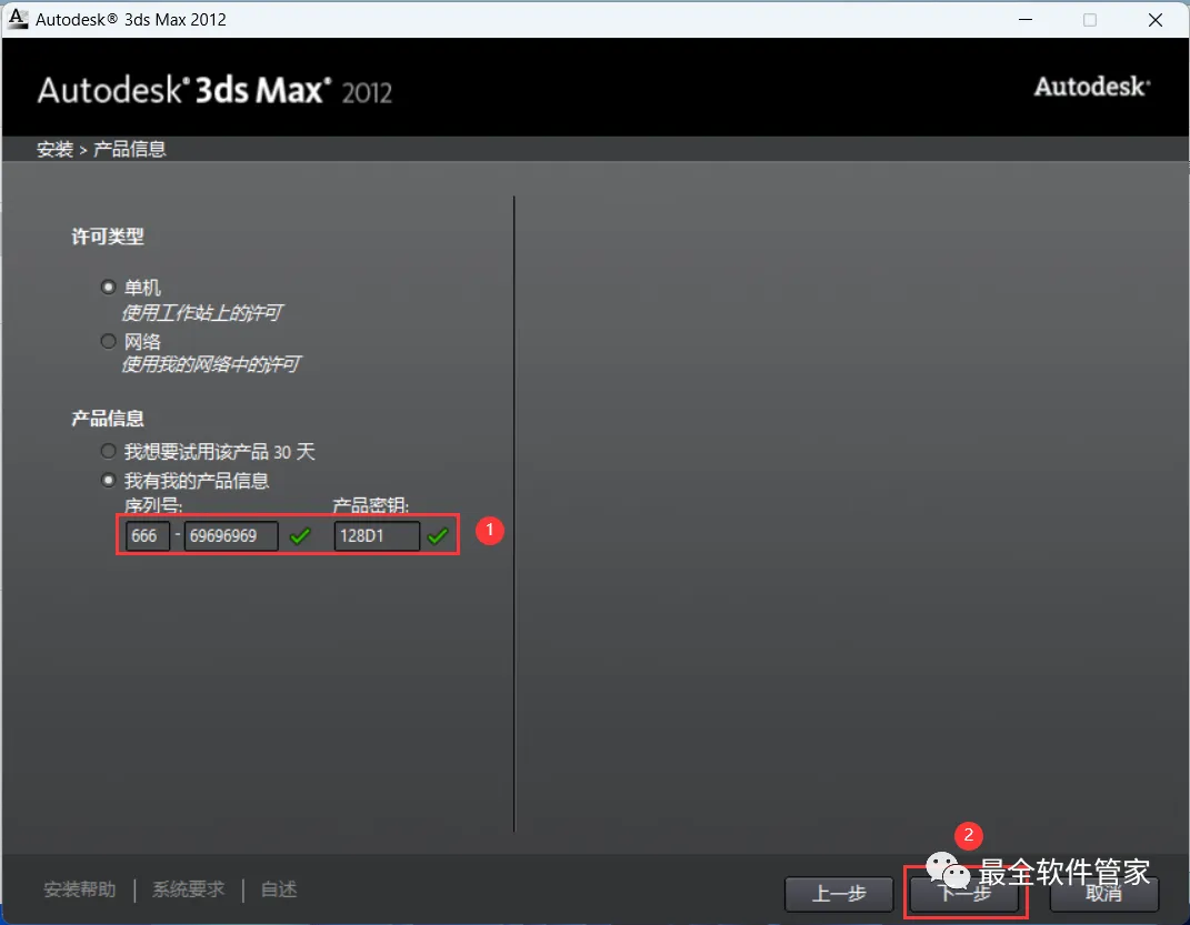 7、序列号输入:666-69696969,产品密钥输入:128D1,再点击【下一步】