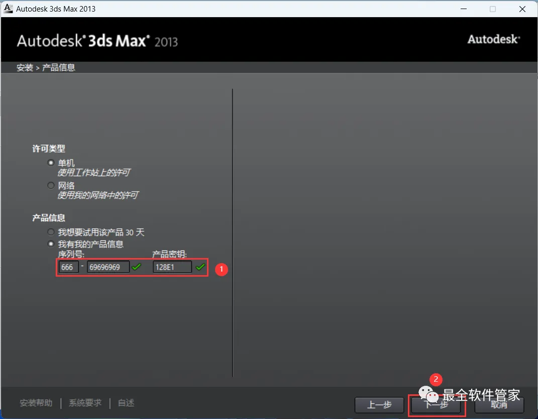 7、序列号输入:666-69696969,产品密钥输入:128E1,再点击【下一步】